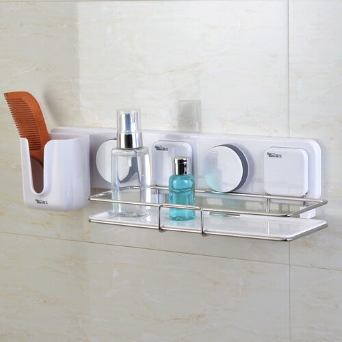 Suction bathroom organizer can be mounted on wall beside shower fixtures with heavy strong rubber suction cup .
