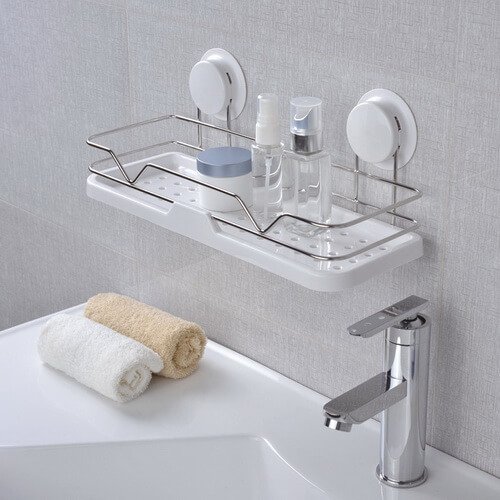 Shower holder suction is designed with draining holes at the bottom of bath shelves , easy to clean and dry .