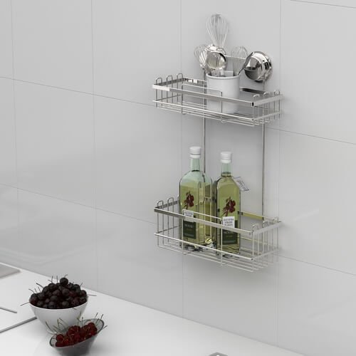 suction 2 tier metal baskets in chrome metal color , just like traditional outlook . Refine and round wire in electric polish well ,no burr ,no sharp welding , safe to use in bathroom to storage .