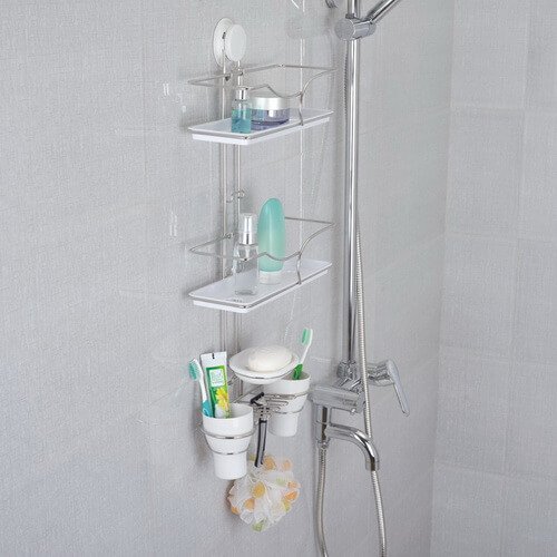 Suction bathroom ladder shelf is designed with 3 tiers -two shelves on top , soap dish and toothbrush holder at the bottom .