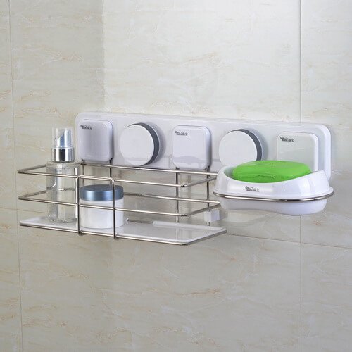 Suction bathroom wall organizer is  assembled by diy components – a soap dish and a shelf ,then fix by suction cup.