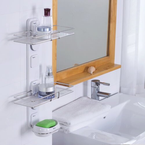 Suction bathroom organizer can be mounted on wall beside shower fixtures with heavy strong rubber suction cup .