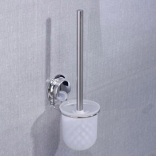 Suction chrome toilet brush comes with heavy duty suction cup , plastic bush and cup holder , stainless steel wire rack and handle .