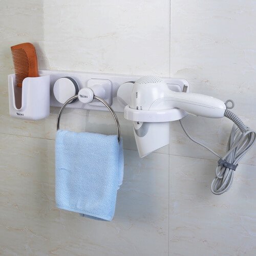 Suction cup bathroom organizer just want to offer you combined baskets to hold towel , hair dryer and makeup accessories .