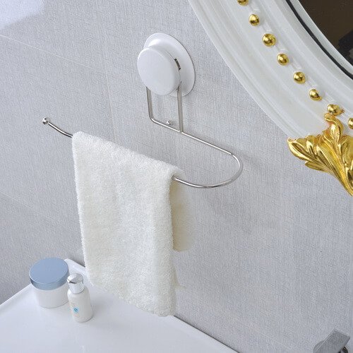 Suction cup towel holder is simple but useful , with the stainless steel rack to hang towel on wall firmly .