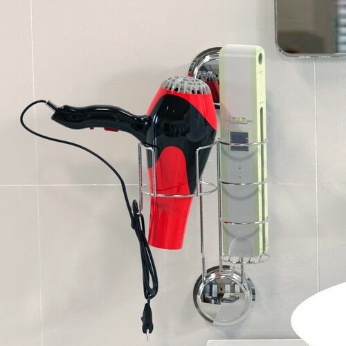 Suction hair dryer storage is assembled with stainless steel wire holder in threaded shape and suction hanging system , support whole hair dryer on wall well .