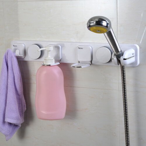 Suction shower shampoo holder  offer versatile function- one piece plastic hook for hanging towel or other thing ;two pieces shampoo hanging holders for body cream or hair shampoo bottle  , the plastic clip with holes in two dimension as per bottle size ; one piece  shower head holder , it allows  change angels when put the shower into the holder.
