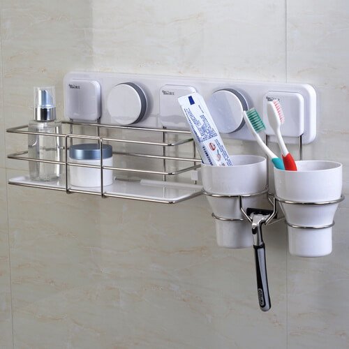 Suction toothbrush holder set offers 2 different functions,one is toothbrush holder , another one is bathroom organizing .